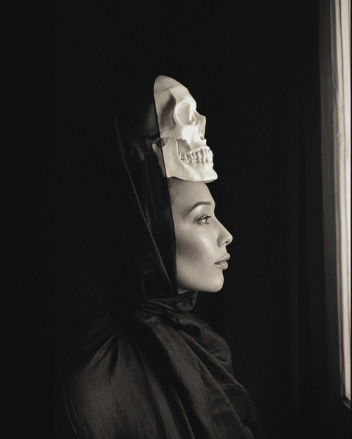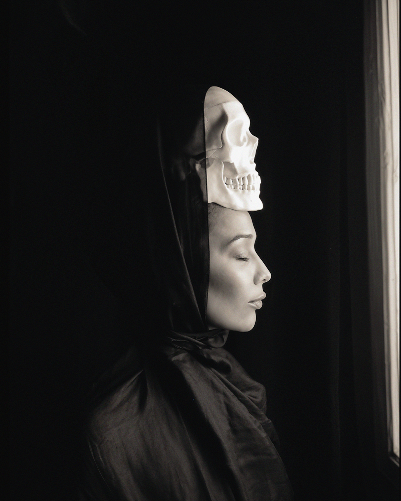 The gesture then imposed itself naturally: carrying the skull on her head, creating a verticality that unifies life and death into a single silhouette. The black veil, enveloping both her face and the object, merges the two heads into one form. What could have been macabre becomes soothing. Presence and Echo do not cultivate a fear of death; they offer another relationship to it, one rooted in continuity rather than rupture.