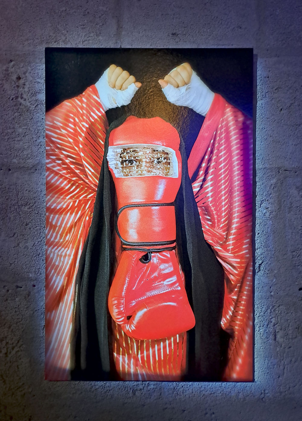 By replacing her head with this gold-inscribed glove, Zohra Hassani transforms constraint into strength. « A woman of gold »: Khelif won Olympic gold, but all women fighting to exist beyond norms are gold. Precious. Indestructible.